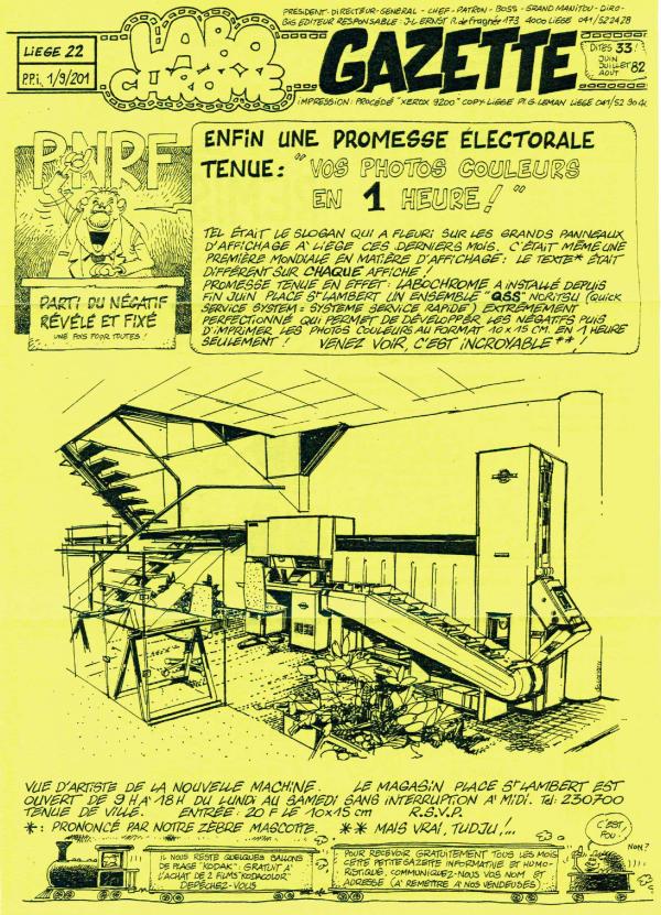 Serge Ernst, le frère du créateur des magasins photo "Labochrome" anima pendant 7 ans cette lettre publicitaire originale. A l'aide de dessins gags, de bande dessinée, de mini-jeux,... Elle présentait toutes les nouveautés, les promotions, les actions commerciales du magasin photo. A celà vient s'ajouter des gags et des informations pratiques dans le domaine de la photographie. Grâce à son contenu rédactionnel, cette publicité pouvait bénéficier du tarif postal préférentiel des périodiques. La Gazette était disponible dans les magasins "Labochrome" ou par abonnement postal gratuit sur demande.