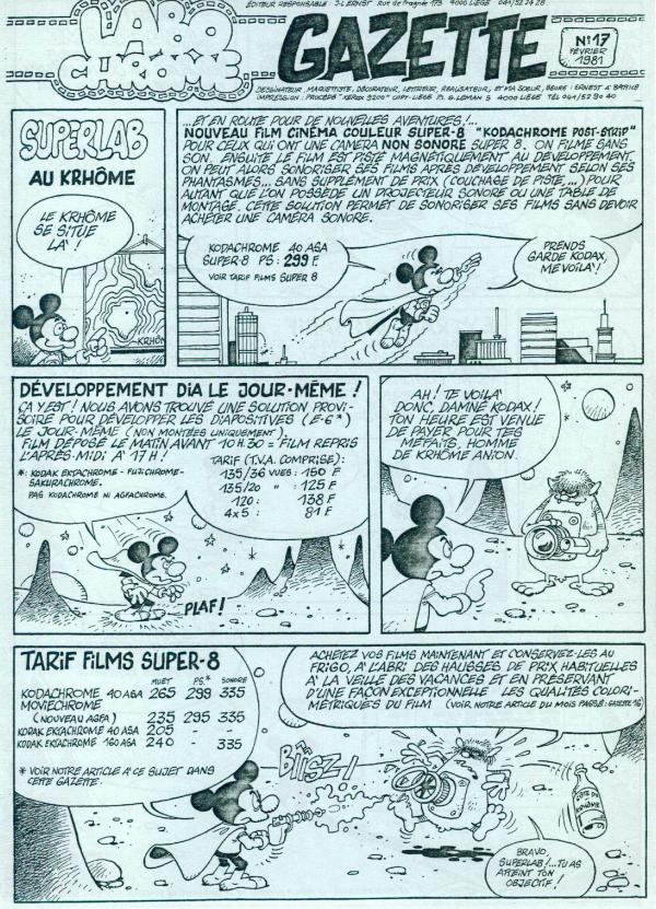 Serge Ernst, le frère du créateur des magasins photo "Labochrome" anima pendant 7 ans cette lettre publicitaire originale. A l'aide de dessins gags, de bande dessinée, de mini-jeux,... Elle présentait toutes les nouveautés, les promotions, les actions commerciales du magasin photo. A celà vient s'ajouter des gags et des informations pratiques dans le domaine de la photographie. Grâce à son contenu rédactionnel, cette publicité pouvait bénéficier du tarif postal préférentiel des périodiques. La Gazette était disponible dans les magasins "Labochrome" ou par abonnement postal gratuit sur demande.